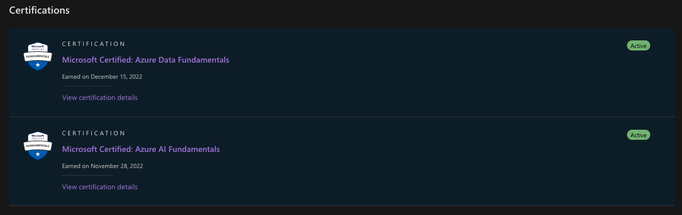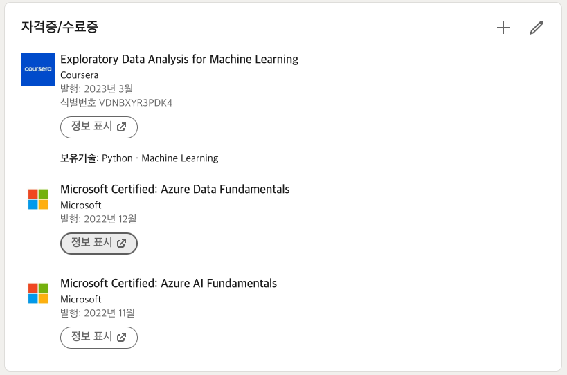 Microsoft AI School 교육 과정은 Microsoft Azure 인증 시스템에 대한 지원도 제공했습니다. 이를 통해 인공 지능(AI-900) 및 데이터 플랫폼(DP-900) 인증을 취득할 수 있었습니다. 시험 준비 자료와 가이드의 도움으로 누구나 노력하면 얻을 수 있다고 생각합니다.