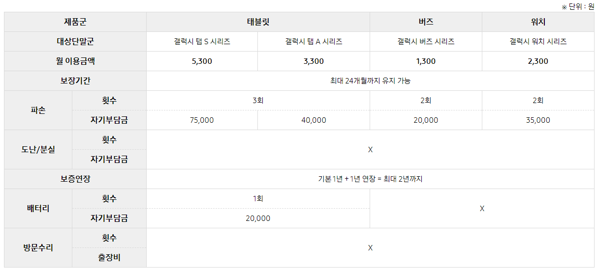 제조사에서 운영하는 시스템이기 때문에 통신3사든 자급제든 알뜰폰이든 등록이 가능하고 일시불이 아닌 월정액제 형태로, 그래서 중간에 있을 수 있습니다. 최대 보유 기간은 스마트폰의 경우 36개월, 기타 기기의 경우 24개월입니다.