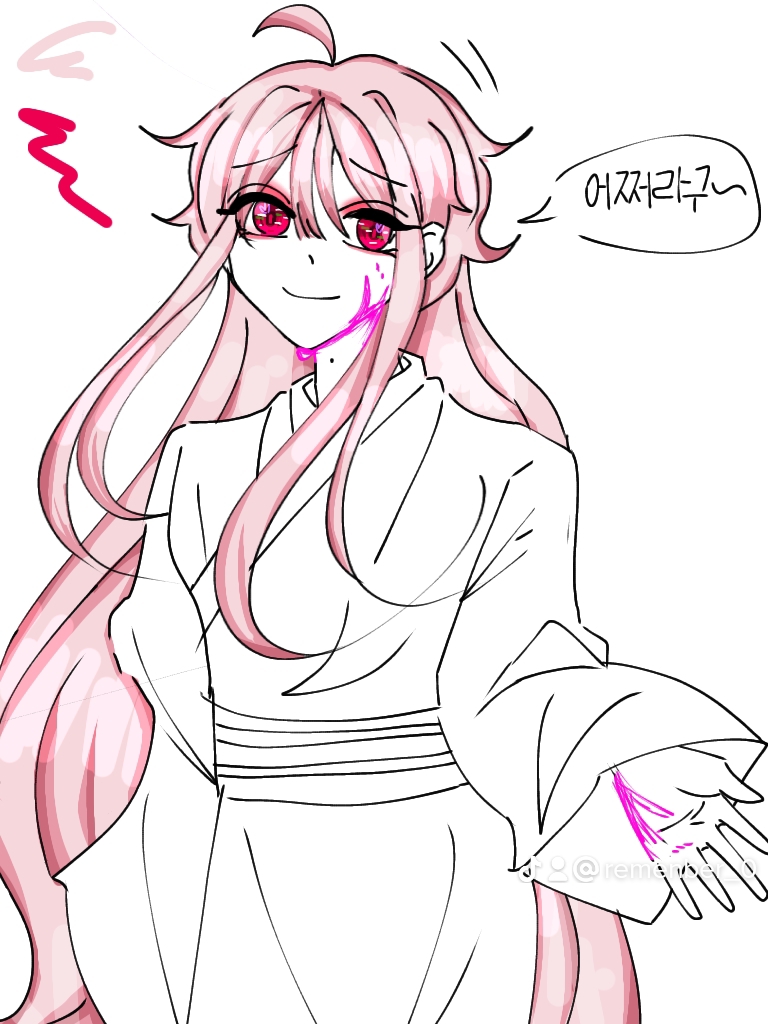 생김새: 딸기우유색 머리칼과 핑크와 레드가 섞인 체리색 눈동자. 살짝 컬이나 웨이브.. 앞서 언급한 것처럼 무릎까지 오는 긴 머리에 눈에 띄지는 않지만 뒷머리를 작은 포니테일로 묶고 옆머리에 꽃을 꽂는 경우가 많다. 그녀는 기모노 스타일의 옷을 입고 눈에 짙은 화장을 하고 있습니다. (사진 첨부)